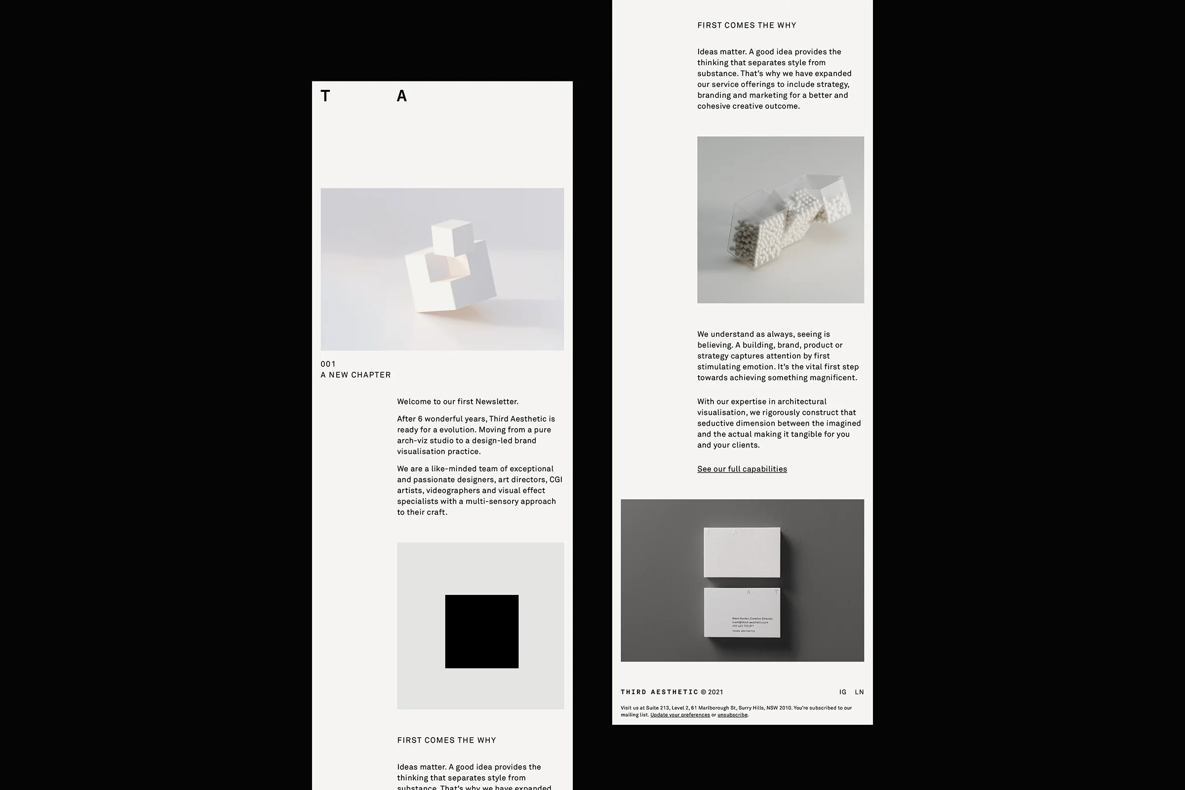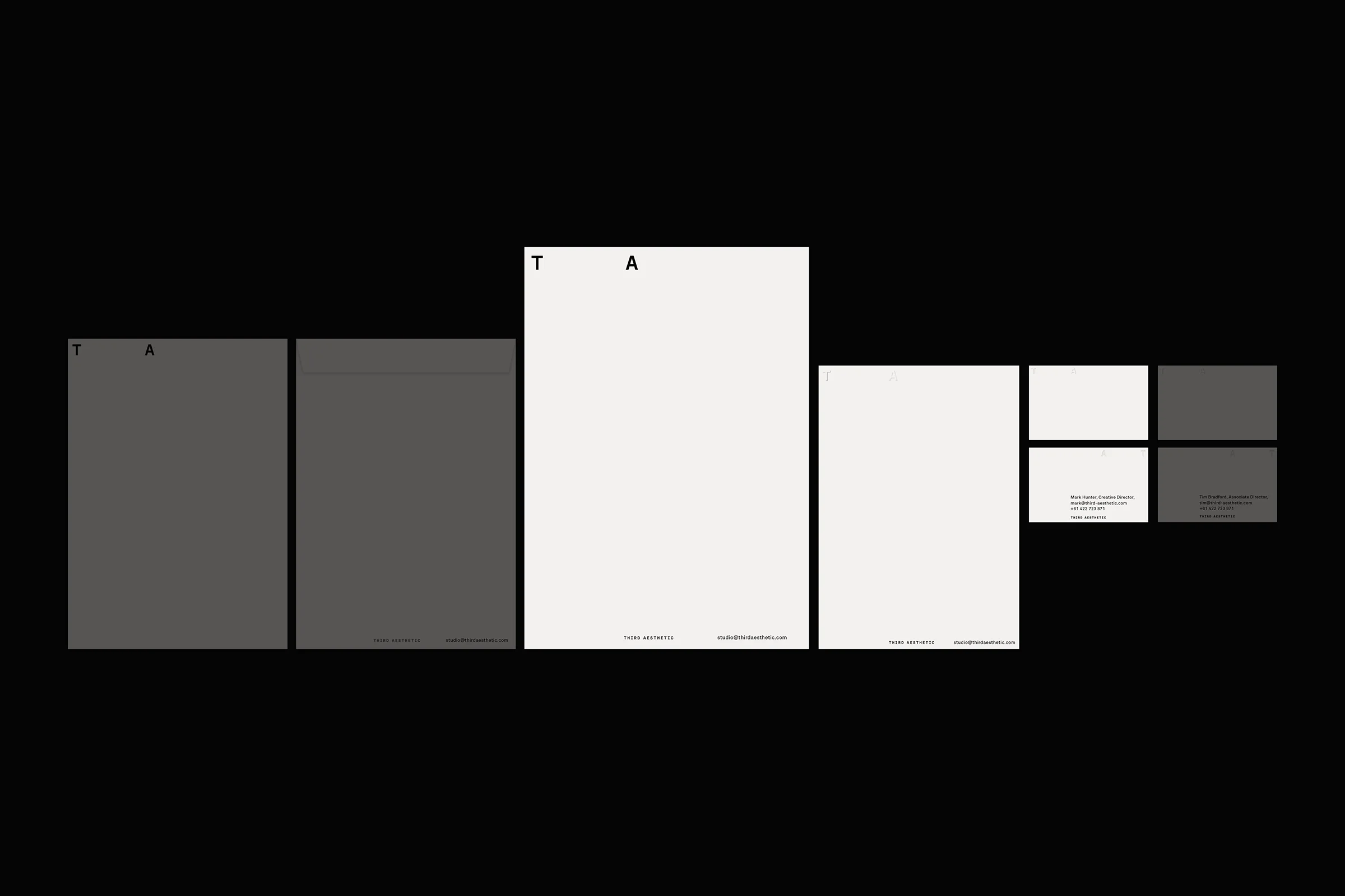 The minimalist brand identity features a pixel in the logo, honouring CGI origins, while a consistent 3-column grid connects with their architectural roots. The abbreviated logo, TA, serves as a manifesto device. The design-led tone of voice resonates internally and externally, solidifying Third Aesthetic as a versatile creative force.